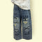 These Kids’ denim jeans come in a classic blue color, featuring bold printed letters and trendy ripped detailing for a stylish streetwear look. Made from soft, durable fabric with an elastic waistband, they ensure both comfort and flexibility for everyday wear.