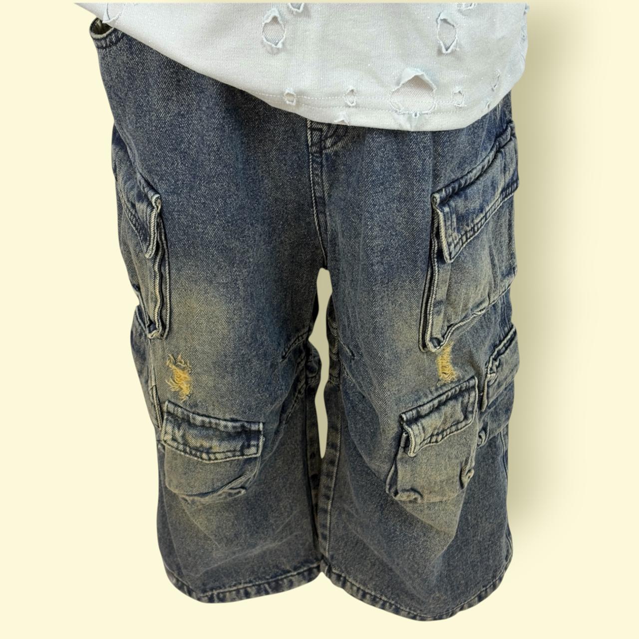Upgrade your boy and Girl casual wardrobe with this rugged and stylish denim cargo pant. Designed with a loose streetwear fit and multiple flap pockets, it combines cool looks with practicality. The distressed faded wash adds a trendy vintage touch, while the soft denim fabric ensures everyday comfort. Perfect for casual outings, travel, or pairing with printed tees and hoodies for a complete look.