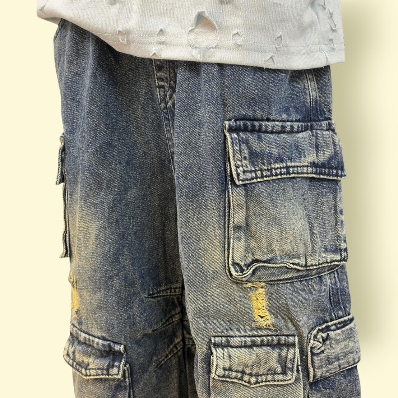 Elastic-Waist Unisex Denim Cargo Pant with Multiple Pockets – Distressed Loose Fit Jeans